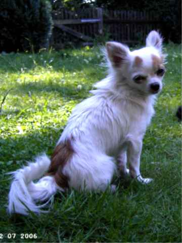 Aber sie hat ein offenes und aufgeschlossenes Wesen und geht gern und mit großem Erfolg auf Ausstellungen. Man kann schon sagen, dass sie der "Kumpel von Deutschland" ist - immer lustig und freundlich zu jedermann und jederhund! Ihr größter Spaß ist es, mit dem Fressen zu warten, bis alle anderen fertig sind und dann gierig um Dipsy's Napf zu stehen, während sie genüsslich demonstriert, dass SIE ja noch etwas hat und die anderen wegknurren kann. Das ist für sie der Moment des Tages, an dem sie Überlegenheit demonstrieren kann. Ansonsten spielt sie mit allen, tobt herum und zeigt keinerlei Dominanzverhalten! |