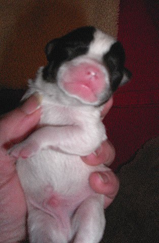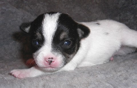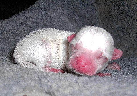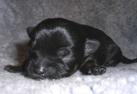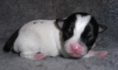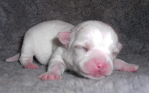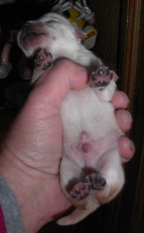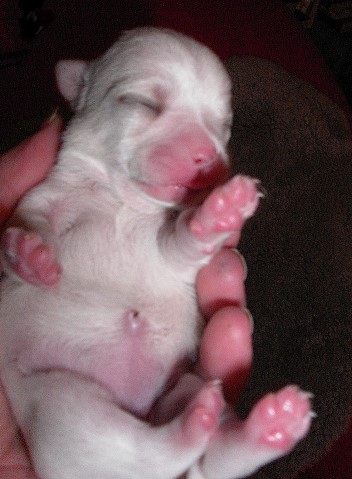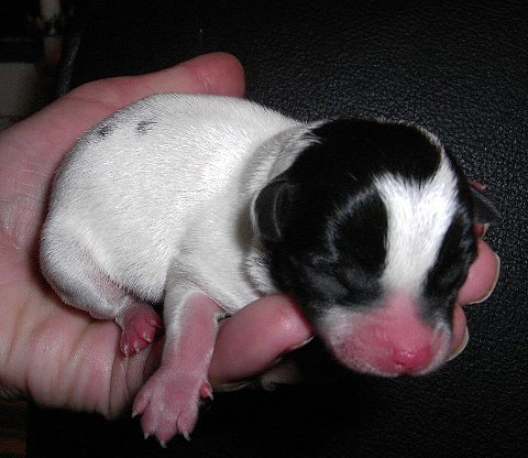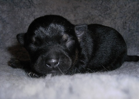 Obwohl die Welpen erst 1 Woche alt sind, hat sich doch schon eine Menge getan! Nicht nur, dass allesamt super zugenommen haben - auch in den Farben werden Veränderungen langsam sichtbar. Bei Hopefull Live und Handsome Hobbit erscheinen langsam Tan-Abzeichen; ebenso an den Wangen von Hole in One. Happy Dancing will offenbar seinem Namen alle Ehre machen und hat schon mal seine Tanzschuh mit Profilsohlen angezogen.