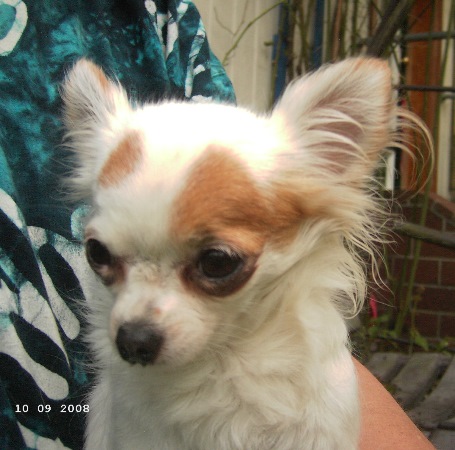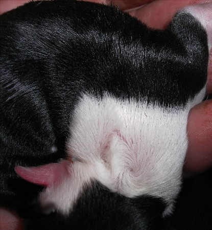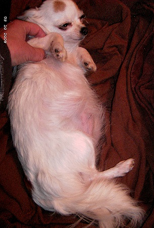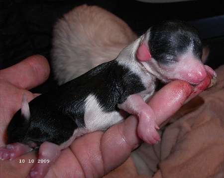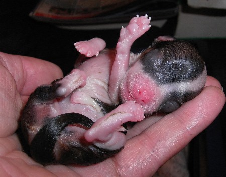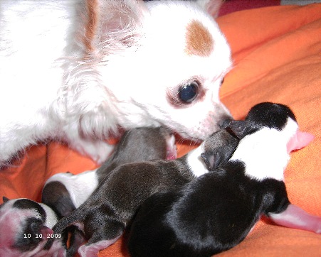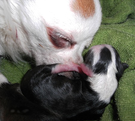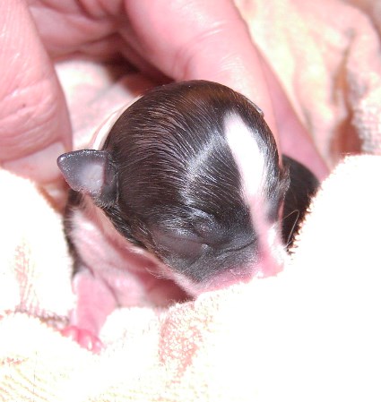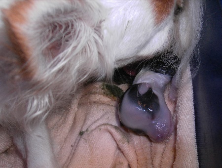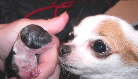Es begann damit, dass mein Dips morgens um 6 h anfing, in meinem Bett zu buddeln. Nu weiß ich ja nicht, ob meinem Wasserbett so eine Buddelei so gut tut - außerdem wollt ich Welpen und keine Seehunde! Also raus, Dips untern Arm und runter. Da war natürlich die Buddelwut verflogen und Dips legte sich erstmal zum Schläfchen hin. Die anderen Züchter wissen, wie das ist, wenn man die Schwangere jede Sekunde beobachtet, immer auf dem Sprung ist....nervlich angespannt bis zum geht-nicht-mehr! So ging es dann zunächst bis Mittag….hin und wieder kam ein Wehchen……noch nix ernstes. Um 15:40 h hat sie das erste Mal leicht gepresst. Schnell Sensiblex gespritzt – tat mich diesmal echt schwer, weil das Dips so klein ist und kein richtiges Nackenfell zum hochziehen hat und weil ich mir letztes Mal die Spritze in den Daumen gejagt habe und….und….und…..letzten Endes hab ich es dann doch geschafft *puh*! Dann kamen Presswehen in großen, aber regelmäßigen Abständen. Dann endlich…..um 18:15 h kam ein kleiner Rüde zur Welt…….wenn ich klein sag, dann meine ich, so wirklich klein. Ganze 73 g brachte der kleine Nelson Mandela auf die Waage. Allerdings blieb die Nachgeburt noch drin. Zunächst, als er noch nass war, dachte ich, er wäre schwarz mit weißem Kragen, aber später erwies er sich als …..hm….chocolate oder später rot….äh…..der Kragen blieb natürlich weiß und so sieht er seinem Papa Moody schon sehr ähnlich.