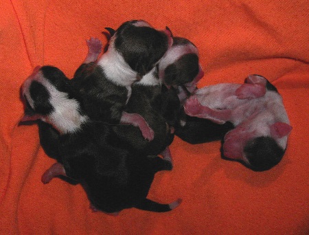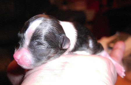 Dipsy war vollkommen selig mit ihren 2 Schnuckeln und dachte wohl, die Sache wäre ausgestanden – war sie aber nicht. Ohne Röntgen hätte ich das auch gedacht, aber es war erst die Hälfte erledigt. Passierte nur nix mehr….keine Wehen, kein Pressen…..Dipsy müde und kollerte sich zum Schlafen zusammen. Ok, meine Mädels legen öfter mal eine längere Pause ein, aber Dipsy übertrieb es entschieden. Ich machte mir Sorgen und rief die TÄ an und bin dann auch sofort los mit Dips und Welpis. Wieder einmal froh, dass meine Welpen immer im unteren Teil der Transportbox geboren werden – so geht der Transport ruckzuck. TÄ gab Dipsy Calcium, Glucose und Oxy (aber nicht viel), weil ihre Wehen zwar stark waren, aber Dipsy sich wohl auch zurückhielt mit der Presserei. Jedenfalls bin ich wieder nach Hause und die TÄ meinte noch, dass es aber noch 1-2 Std dauern könnte, bis das nächste Baby kam. Mit Dips ging es weiter wie bisher, schlafen, Babys kuscheln und versorgen, wehen, pressen und alles von vorn. Dann, gerade fest entschlossen, wieder zum TA zu fahren (der Deckel von der Box war schon wieder drauf), legte Dips noch mal richtig los – und es erschien…….die Nachgeburt vom 1. Rüden *natoll*. Offenbar hatte sie den Ausgang versperrt und das folgende Welpchen konnte nicht vorbei. Dipsy knabberte noch wie wild auf der Nachgeburt herum, da drängte auch schon das Baby raus. Als ich es in der Blase zu Gesicht bekam, wusste ich zunächst nicht, was das nu war. Die Hinterpfote lag neben dem Kopf, der zuerst erschien. Die Gliedmaßen sahen teilweise etwas verkrüppelt aus und geschwollen, aber das hat sich inzwischen weitgehend wieder zurückgebildet. Sie wog 80 g, hat aber als einzige bis zum nächsten Tag auf 73 g abgenommen – allerdings trinkt sie und es scheint ihr gut zu gehen. Sie ist schwarz mit weißem Kragen…..noch ein Moody *ggg* - und voll niedlich ist, dass sie im Nacken einen Wirbel hat, so dass ihr die Haare wie eine Mähne hochstehen……wie bei Nita, wer sie noch kennt. Daher heißt sie erstmal Navajo, denn so ein kleines Indianer-Mädel braucht einen entsprechenden Namen…..is klar! Achso – sie ist übrigens um 2:45 h geboren.
